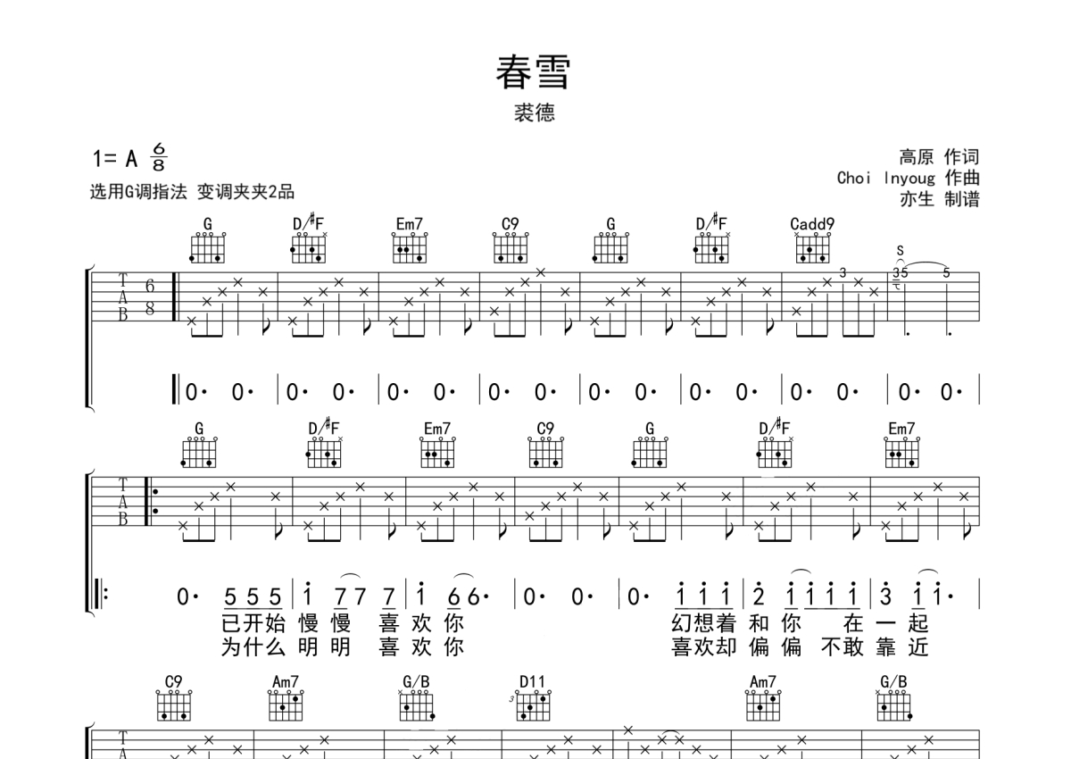 《春雪》是裘德演唱的一首歌曲,拍号为6/8拍,歌曲原调为G调,本吉他谱采用的是G调指法编配,变调夹2品弹奏即为原调,当然也可以根据自己的音域改变变调夹位置,或者通过改变和弦调性,以方便自己弹奏,这份吉他谱共有两张高清图谱,图谱由 @亦生 编配上传,图谱使用六线谱编配,包含吉他和弦指法、简谱以及歌词部分,使用这份春雪吉他谱,可以让你更加方便地掌握这首歌曲的弹唱技巧,快来尝试吧。