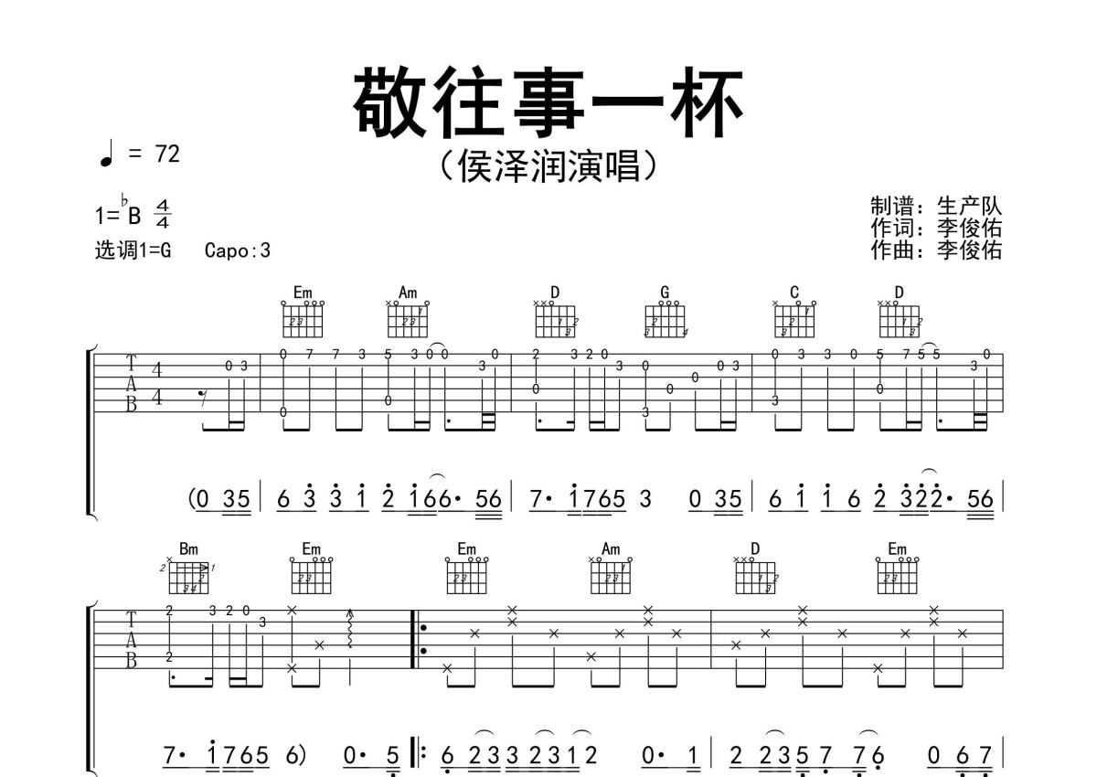 《敬往事一杯》是侯泽润演唱的一首歌曲,精编完美版,拍号为4/4拍,歌曲速度为每分钟72拍,歌曲原调为Bb调,但由于原调指法比较难,为了方便弹奏,本吉他谱采用的是G调指法编配,变调夹3品弹奏即为原调,当然也可以根据自己的音域改变变调夹位置,或者通过改变和弦调性,以方便自己弹奏,这份吉他谱共有三张高清图谱,图谱由 @生产队 编配上传,图谱使用六线谱编配,包含吉他和弦指法、简谱以及歌词部分,使用这份敬往事一杯吉他谱,可以让你更加方便地掌握这首歌曲的弹唱技巧,快来尝试吧。侯泽润演唱的歌曲《敬往事一杯》原版吉他谱,精准的前奏、间奏、尾奏solo编配,精编完美版,值得推荐!。