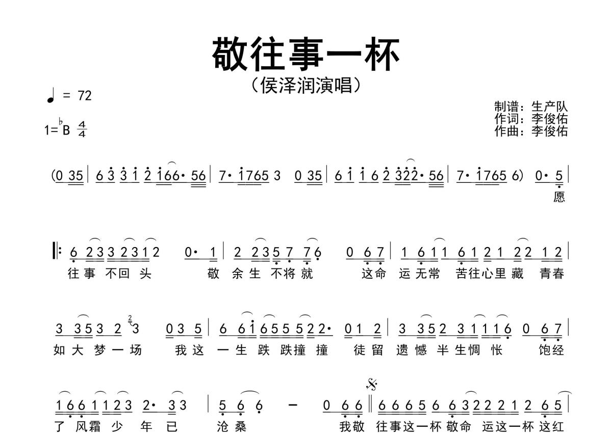 《敬往事一杯》是侯泽润演唱的一首歌曲,原版简谱,拍号为4/4拍,歌曲速度为每分钟72拍,这份简谱共有一张高清图谱,图谱由 @生产队 编配上传侯泽润演唱的歌曲《敬往事一杯》原版简谱,精准的前奏、间奏、尾奏solo编配,精编完美版,值得推荐!。