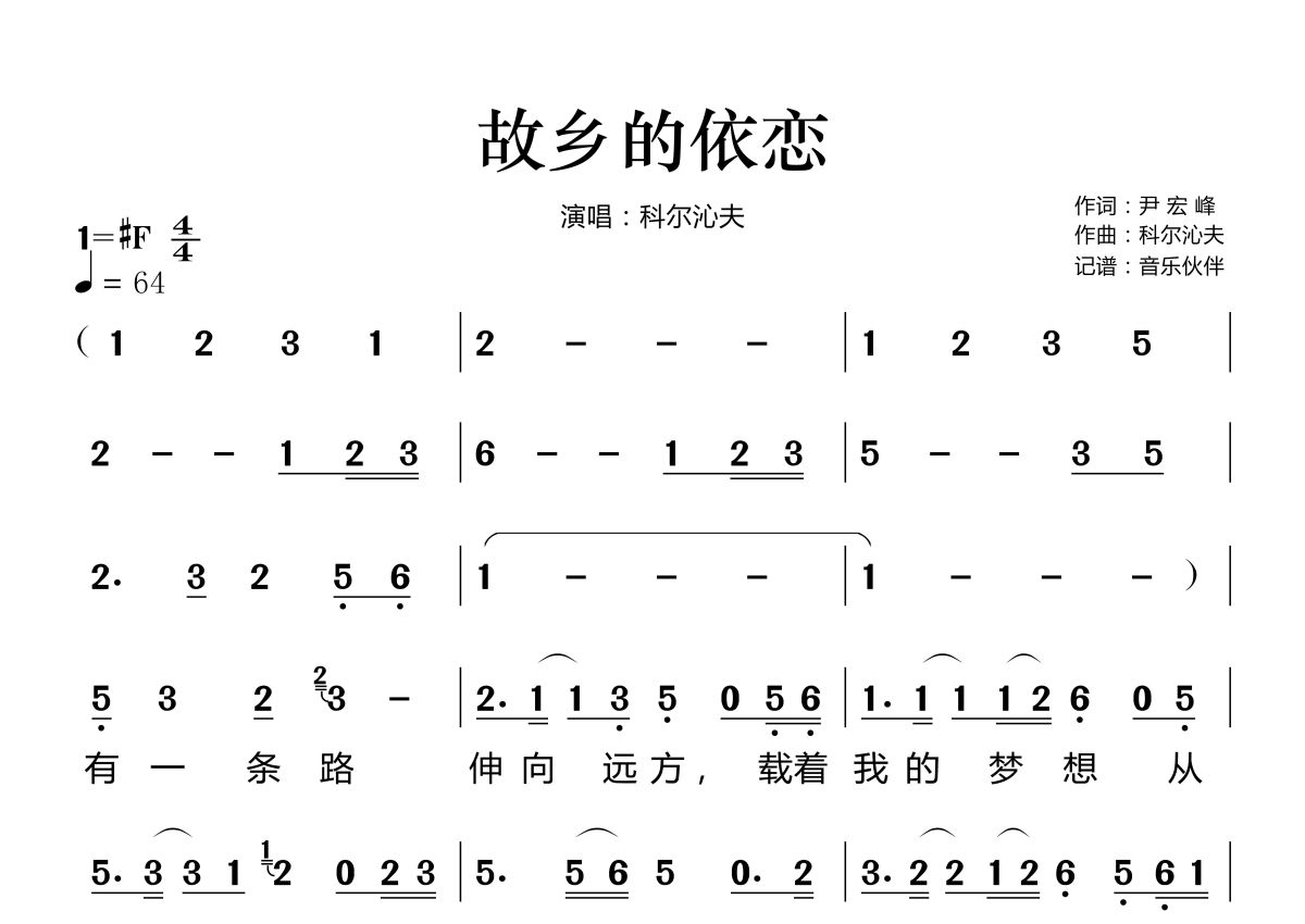 《故乡的依恋》是科尔沁夫演唱的一首歌曲,拍号为4/4拍,歌曲速度为每分钟64拍,这份简谱共有两张高清图谱,图谱由 @音乐伙伴 编配上传。