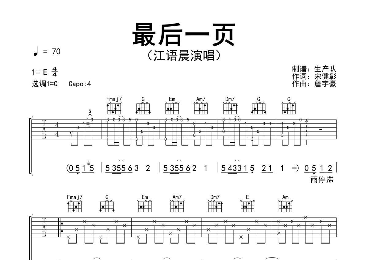 《最后一页》是江语晨演唱的一首歌曲,精编完美版,拍号为4/4拍,歌曲速度为每分钟70拍,歌曲原调为E调,但由于原调指法比较难,为了方便弹奏,本吉他谱采用的是C调指法编配,变调夹4品弹奏即为原调,当然也可以根据自己的音域改变变调夹位置,或者通过改变和弦调性,以方便自己弹奏,这份吉他谱共有三张高清图谱,图谱由 @生产队 编配上传,图谱使用六线谱编配,包含吉他和弦指法、简谱以及歌词部分,使用这份最后一页吉他谱,可以让你更加方便地掌握这首歌曲的弹唱技巧,快来尝试吧。江语晨演唱的歌曲《最后一页》原版吉他谱,精准的前奏、间奏、尾奏solo编配,精编完美版,值得推荐!。