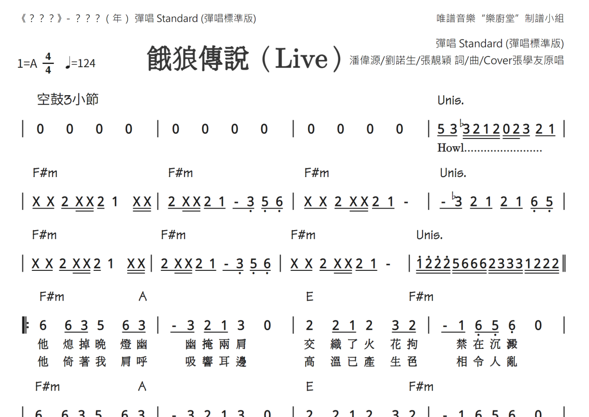 《饿狼传说(Live)》是Live演唱的一首歌曲,弹唱标准版,这份简谱共有三张高清图谱,图谱由 @唯谱音乐"乐厨堂"发布小组 编配上传。