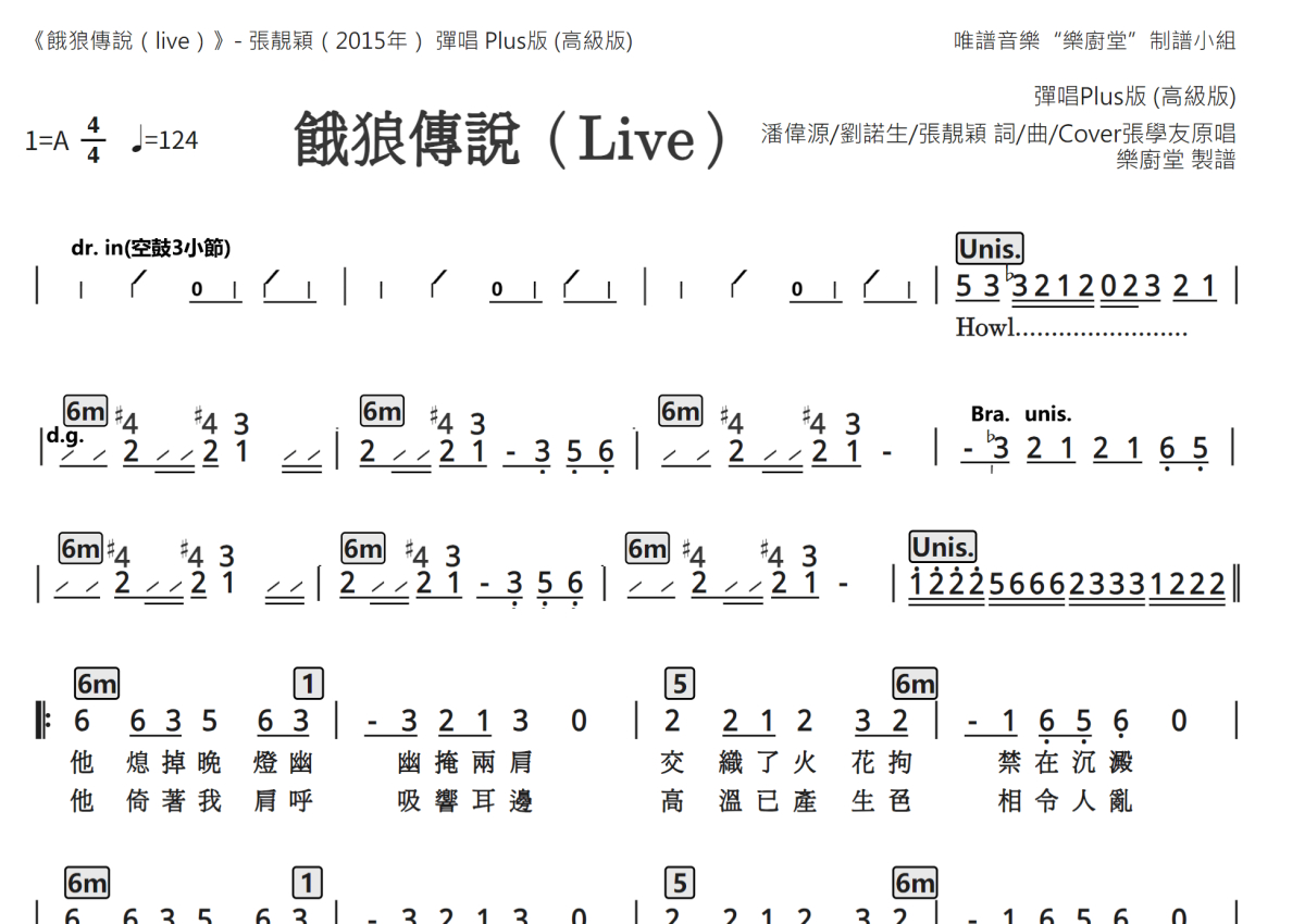 《饿狼传说(Live)》是Live演唱的一首歌曲,弹唱专业版,这份简谱共有三张高清图谱,图谱由 @唯谱音乐"乐厨堂"发布小组 编配上传。