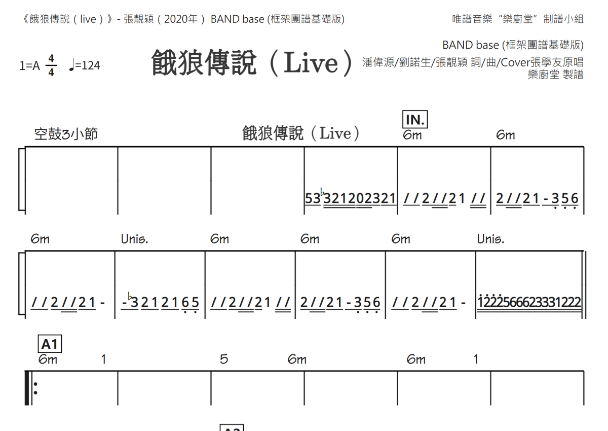 《饿狼传说(Live)》是Live演唱的一首歌曲,框架基础版,这份乐队总谱共有三张高清图谱,图谱由 @唯谱音乐"乐厨堂"发布小组 编配上传。