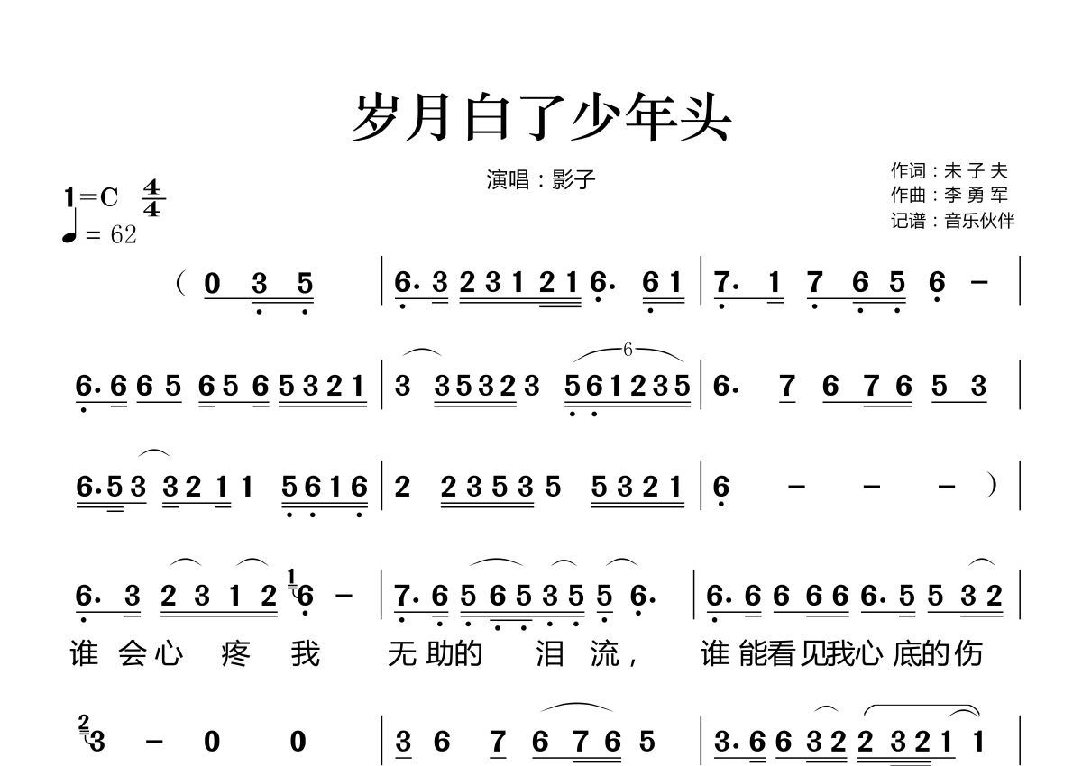 《岁月白了少年头》是影子演唱的一首歌曲,拍号为4/4拍,歌曲速度为每分钟62拍,这份简谱共有两张高清图谱,图谱由 @音乐伙伴 编配上传。