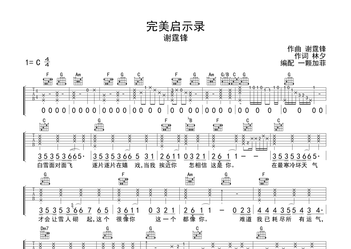 《完美启示录》是谢霆锋演唱的一首歌曲,本吉他谱采用的是C调指法编配,这份吉他谱共有两张高清图谱,图谱由 @一颗加菲 编配上传,图谱使用六线谱编配,包含吉他和弦指法、简谱以及歌词部分,曲谱配备了相关的音频提供试听,使用这份完美启示录吉他谱,可以让你更加方便地掌握这首歌曲的弹唱技巧,快来尝试吧。