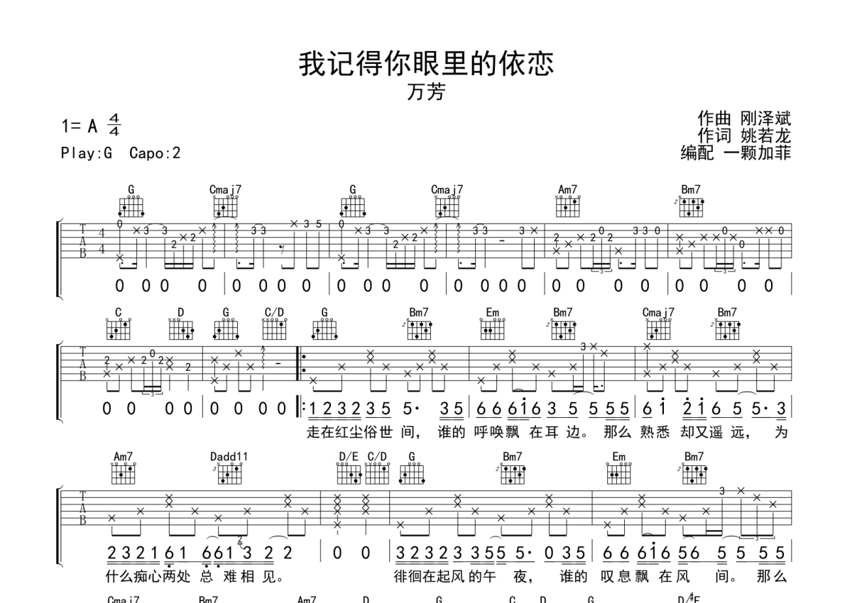 《我记得你眼里的依恋》是万芳演唱的一首歌曲,本吉他谱采用的是G调指法编配,这份吉他谱共有两张高清图谱,图谱由 @一颗加菲 编配上传,图谱使用六线谱编配,包含吉他和弦指法、简谱以及歌词部分,使用这份我记得你眼里的依恋吉他谱,可以让你更加方便地掌握这首歌曲的弹唱技巧,快来尝试吧。