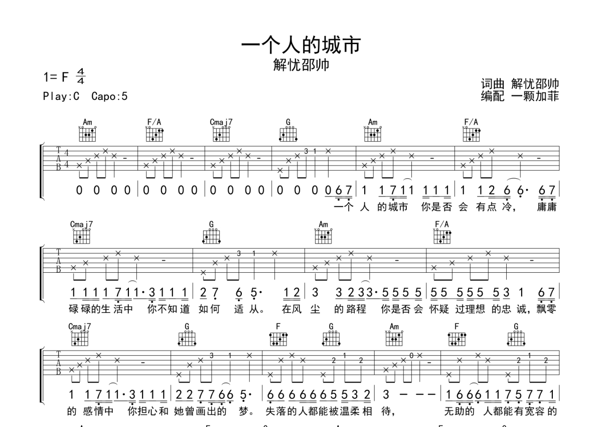 一个人的城市吉他谱 - 解忧邵帅演唱 - C调弹唱六线谱