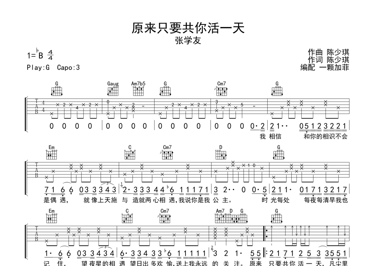 《原来只要共你活一天》是张学友演唱的一首歌曲,本吉他谱采用的是G调指法编配,这份吉他谱共有两张高清图谱,图谱由 @一颗加菲 编配上传,图谱使用六线谱编配,包含吉他和弦指法、简谱以及歌词部分,曲谱配备了相关的音频提供试听,使用这份原来只要共你活一天吉他谱,可以让你更加方便地掌握这首歌曲的弹唱技巧,快来尝试吧。