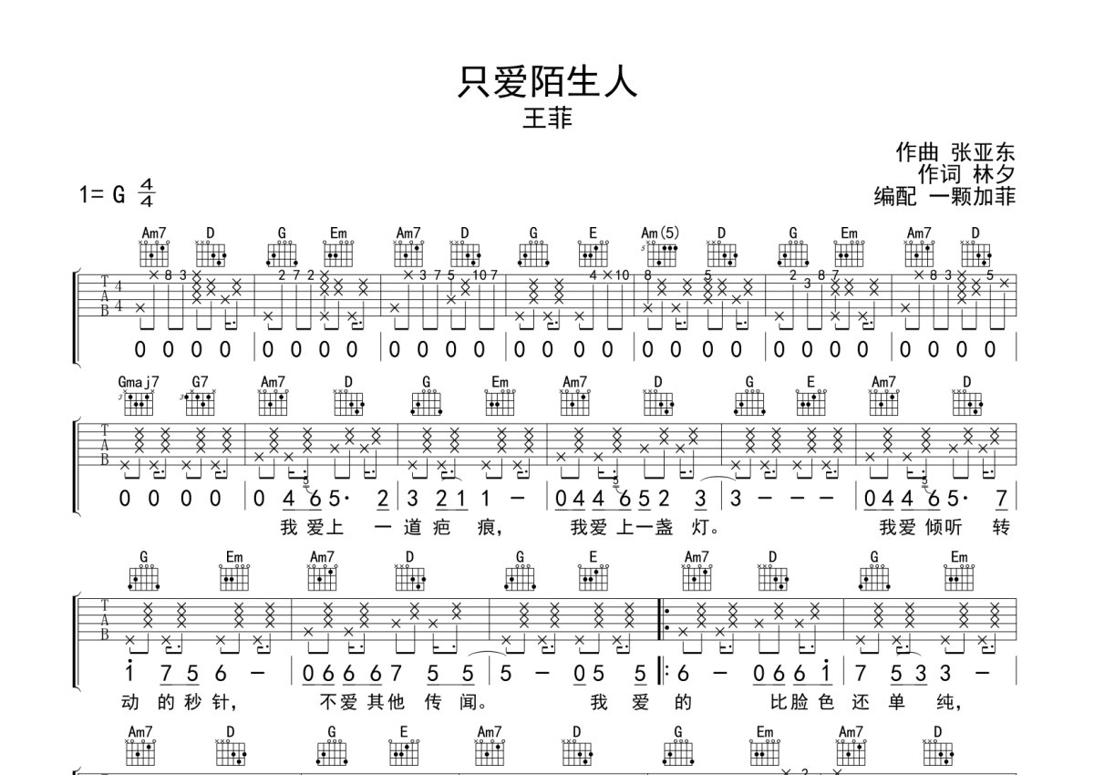 王菲《只爱陌生人》吉他谱 - G调弹唱六线谱