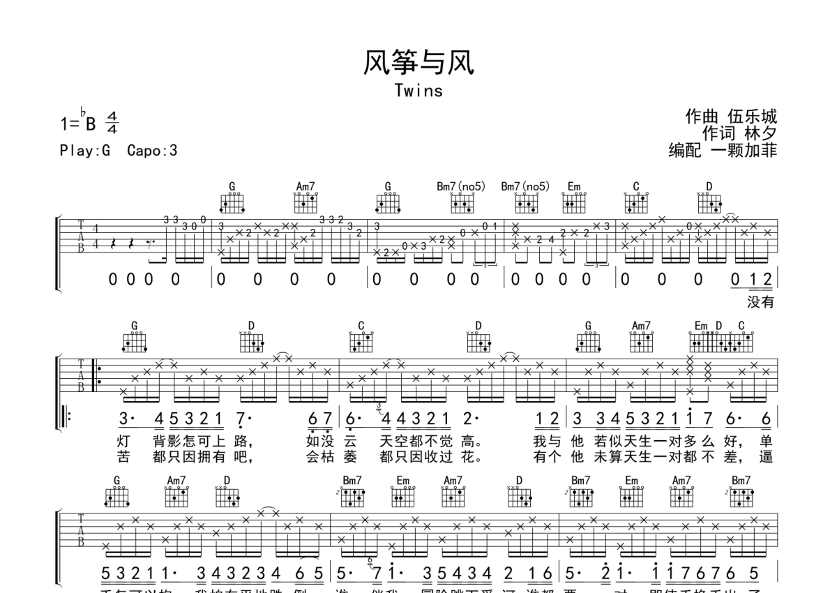 Twins《风筝与风》吉他谱 - G调弹唱六线谱