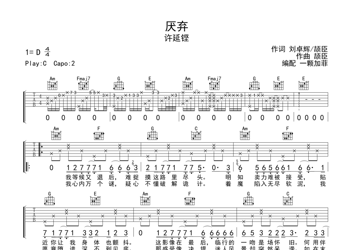 许延铿《厌弃》吉他谱 - C调弹唱六线谱