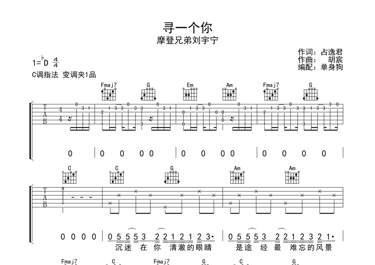 《寻一个你》是刘宇宁演唱的一首歌曲,本吉他谱采用的是C调指法编配,这份吉他谱共有三张高清图谱,图谱由 @单身狗 编配上传,图谱使用六线谱编配,包含吉他和弦指法、简谱以及歌词部分,使用这份寻一个你吉他谱,可以让你更加方便地掌握这首歌曲的弹唱技巧,快来尝试吧。刘宇宁《寻一个你》吉他弹唱谱,采用C调指法编配,单身狗编配出品,共有3张高清图谱。