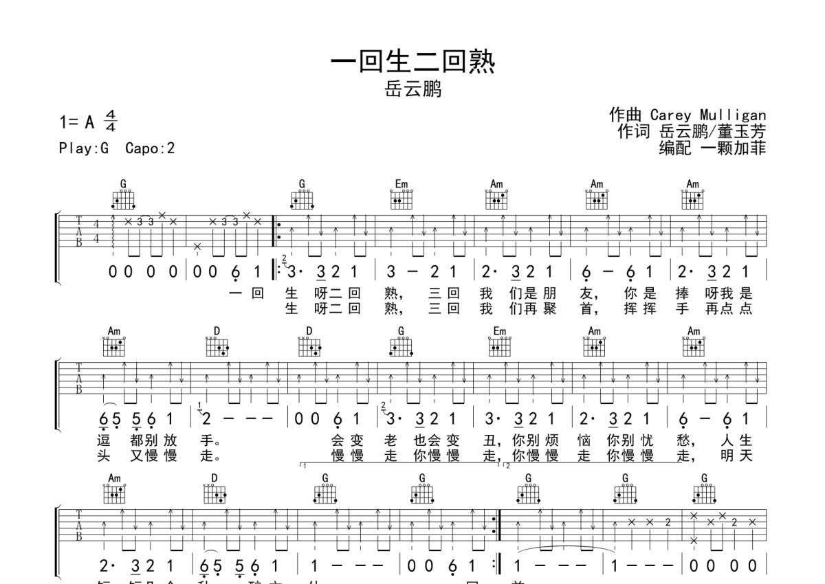 岳云鹏《一回生二回熟》吉他谱 - G调弹唱六线谱