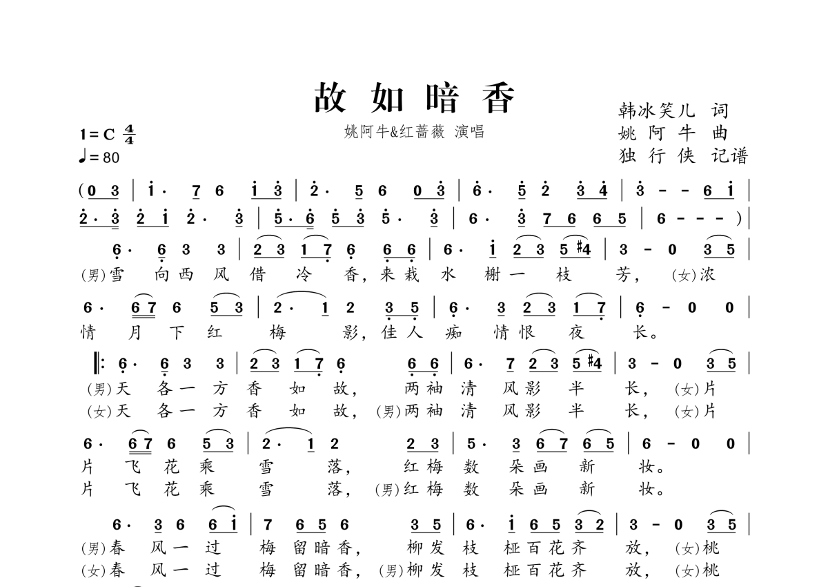 故如暗香(国语合唱版)简谱 - 姚阿牛、红蔷薇演唱