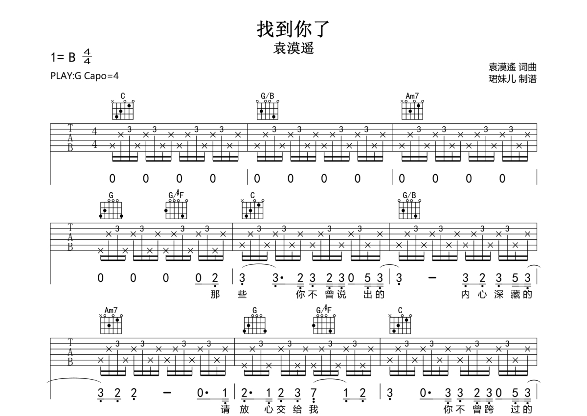 《找到你了》是李可晴演唱的一首歌曲,拍号为4/4拍,歌曲速度为每分钟85拍,歌曲原调为G调,本吉他谱采用的是G调指法编配,变调夹4品弹奏即为原调,当然也可以根据自己的音域改变变调夹位置,或者通过改变和弦调性,以方便自己弹奏,这份吉他谱共有两张高清图谱,图谱由 @珺妹儿 编配上传,图谱使用六线谱编配,包含吉他和弦指法、简谱以及歌词部分,使用这份找到你了吉他谱,可以让你更加方便地掌握这首歌曲的弹唱技巧,快来尝试吧。