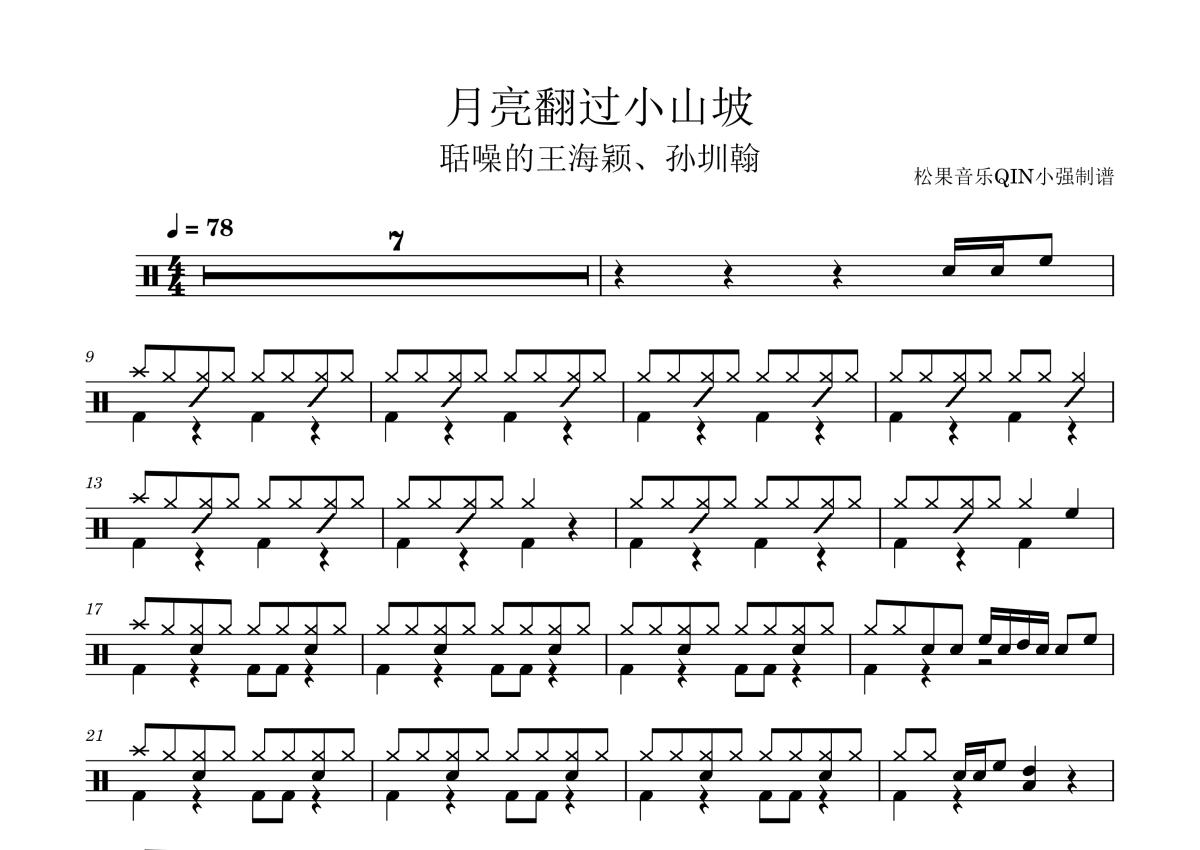 孙圳翰/聒噪的王海颖《月亮翻过小山坡》架子鼓谱