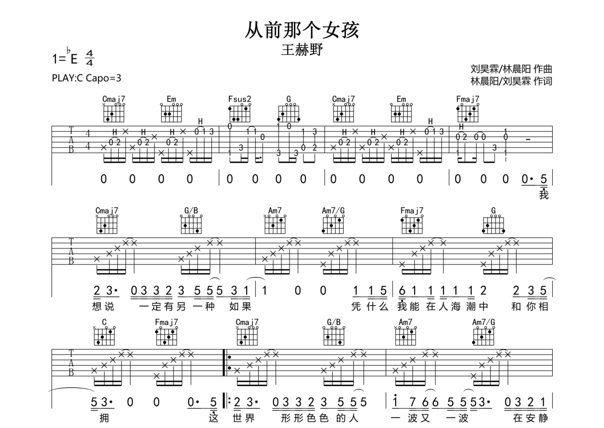 从前那个女孩吉他谱 - 王赫野珺妹儿编配