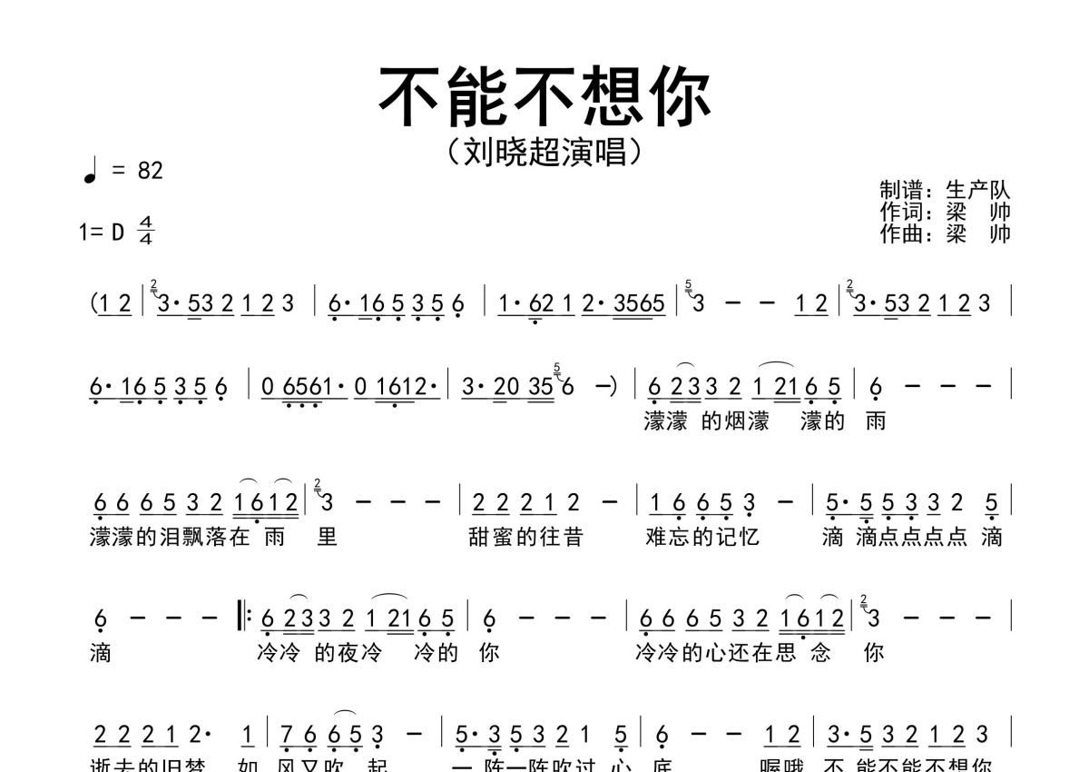 《不能不想你》是刘晓超演唱的一首歌曲,原版简谱,拍号为4/4拍,歌曲速度为每分钟82拍,这份简谱共有一张高清图谱,图谱由 @生产队 编配上传刘晓超演唱的歌曲《不能不想你》原版简谱,精准的前奏、间奏、尾奏solo编配,精编完美版,值得推荐!。
