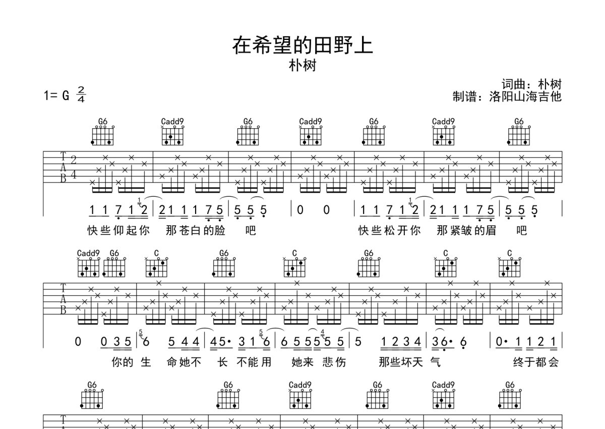 朴树《在希望的田野上》吉他谱 - G调弹唱六线谱