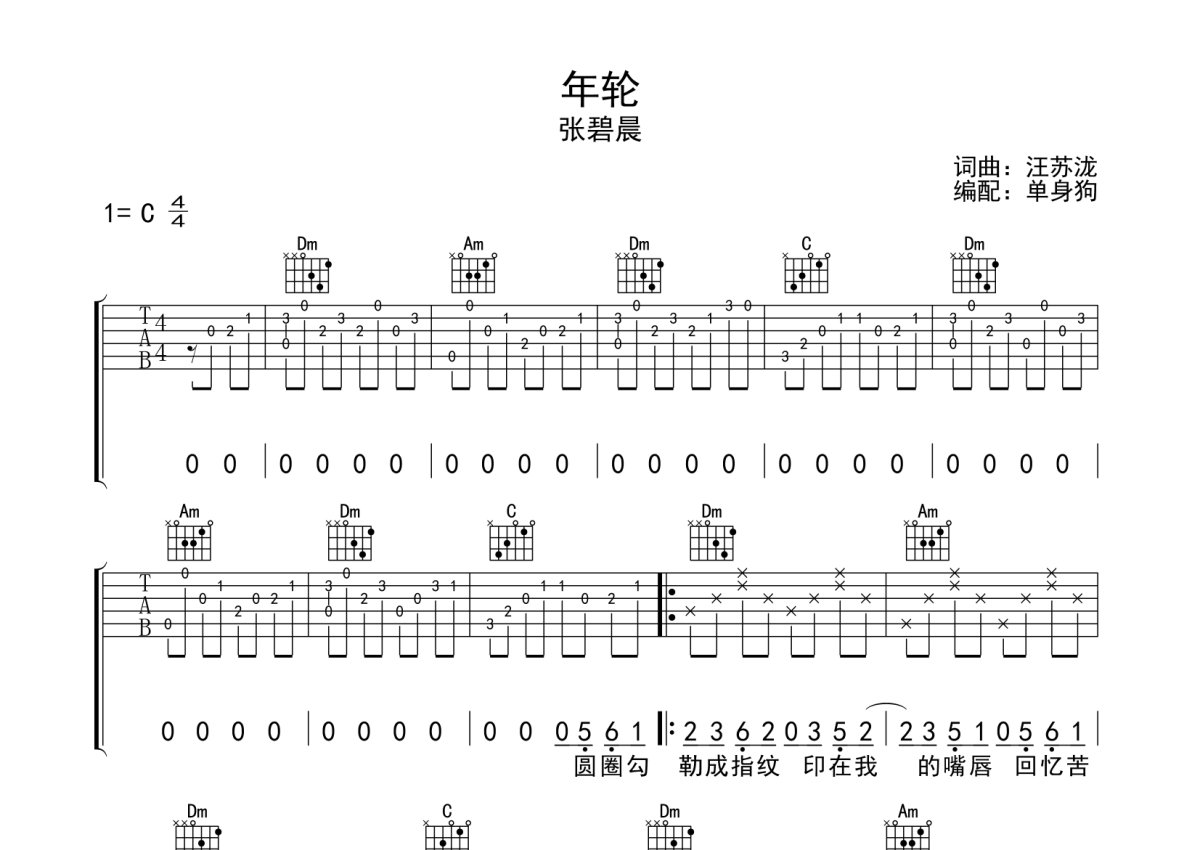 张碧晨《年轮》吉他谱 - C调弹唱六线谱