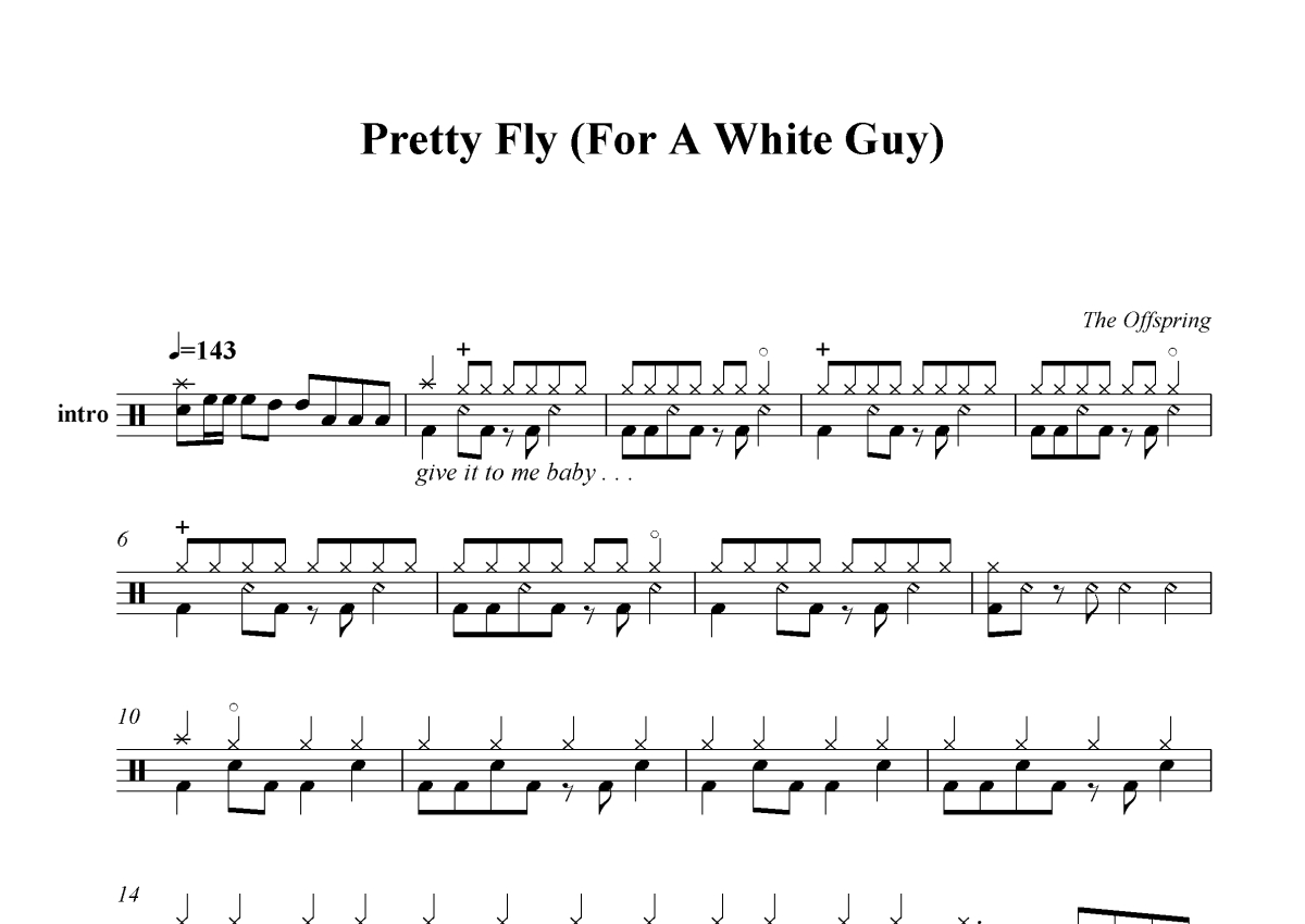 《Pretty Fly》是后裔合唱团演唱的一首歌曲,拍号为4/4拍,歌曲速度为每分钟143拍,这份架子鼓谱共有三张高清图谱,图谱由 @音符喷血者 编配上传,图谱使用五线谱编配,使用这份Pretty Fly架子鼓谱,你将能够轻松地敲打出这首后裔合唱团的Pretty Fly,快来尝试吧。