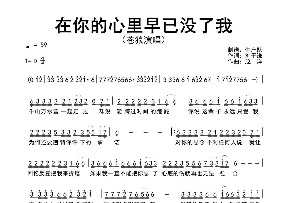 《在你的心里早已没了我》是苍狼演唱的一首歌曲,原版简谱,拍号为4/4拍,歌曲速度为每分钟59拍,这份简谱共有一张高清图谱,图谱由 @生产队 编配上传苍狼演唱的歌曲《在你的心里早已没了我》原版简谱,精准的前奏、间奏、尾奏solo编配,精编完美版,值得推荐!。