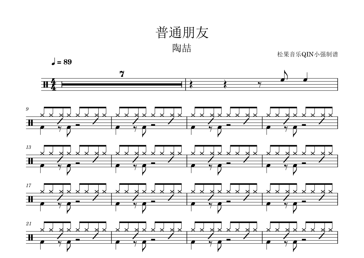 《普通朋友》是陶喆演唱的一首歌曲,拍号为4/4拍,这份架子鼓谱共有两张高清图谱,图谱由 @松果音乐QIN小强 编配上传,图谱使用五线谱编配,使用这份普通朋友架子鼓谱,你将能够轻松地敲打出这首陶喆的普通朋友,快来尝试吧。《普通朋友》是由陶喆、娃娃作词,陶喆作曲并演唱的歌曲,收录在陶喆于1999年12月10日发行的的第二张个人专辑《I'm OK》中。