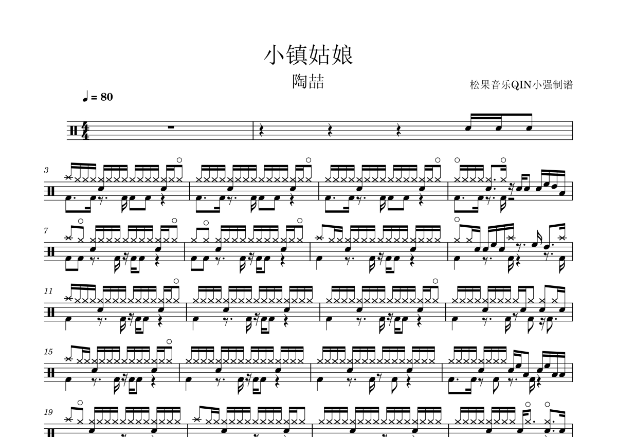 《小镇姑娘》是陶喆演唱的一首歌曲,拍号为4/4拍,这份架子鼓谱共有两张高清图谱,图谱由 @松果音乐QIN小强 编配上传,图谱使用五线谱编配,使用这份小镇姑娘架子鼓谱,你将能够轻松地敲打出这首陶喆的小镇姑娘,快来尝试吧。《小镇姑娘》是陶喆作词、作曲、编曲并演唱的节奏蓝调歌曲,收录于1999年12月10日发行的音乐专辑《I'm OK》中。