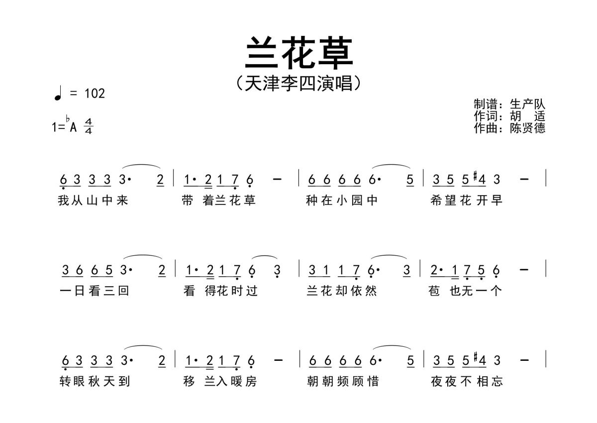 《兰花草》是天津李四演唱的一首歌曲,原版简谱,拍号为4/4拍,歌曲速度为每分钟102拍,这份简谱共有一张高清图谱,图谱由 @生产队 编配上传天津李四演唱的歌曲《兰花草》原版简谱,精准的间奏、尾奏solo编配,精编完美版,值得推荐!。