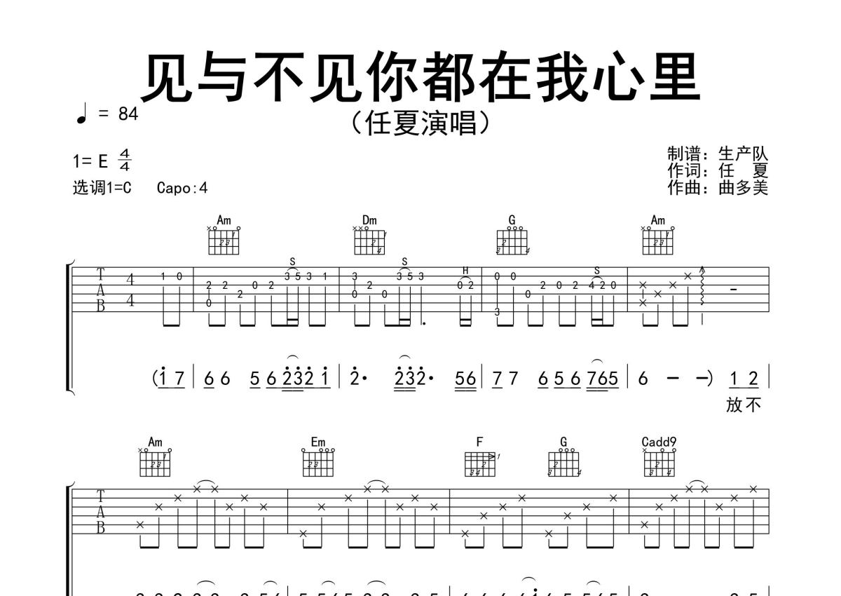 《见与不见你都在我心里》是任夏演唱的一首歌曲,精编完美版,拍号为4/4拍,歌曲速度为每分钟84拍,歌曲原调为E调,但由于原调指法比较难,为了方便弹奏,本吉他谱采用的是C调指法编配,变调夹4品弹奏即为原调,当然也可以根据自己的音域改变变调夹位置,或者通过改变和弦调性,以方便自己弹奏,这份吉他谱共有三张高清图谱,图谱由 @生产队 编配上传,图谱使用六线谱编配,包含吉他和弦指法、简谱以及歌词部分,使用这份见与不见你都在我心里吉他谱,可以让你更加方便地掌握这首歌曲的弹唱技巧,快来尝试吧。任夏演唱的歌曲《见与不见你都在我心里》原版吉他谱,精准的前奏、间奏、尾奏solo编配,精编完美版,值得推荐!。
