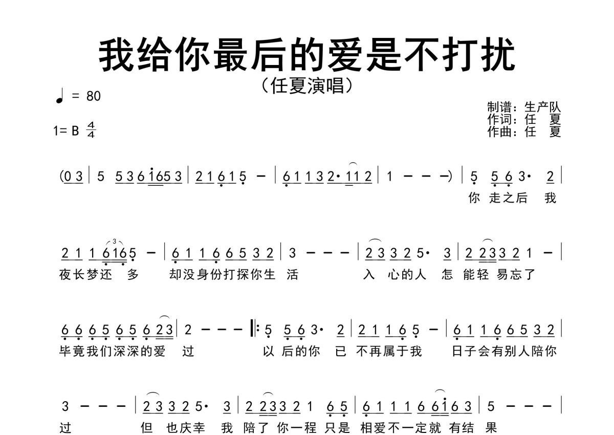 《我给你最后的爱是不打扰》是任夏演唱的一首歌曲,原版简谱,拍号为4/4拍,歌曲速度为每分钟80拍,这份简谱共有一张高清图谱,图谱由 @生产队 编配上传任夏演唱的歌曲《我给你最后的爱是不打扰》原版简谱,精准的前奏、间奏、尾奏solo编配,精编完美版,值得推荐!。