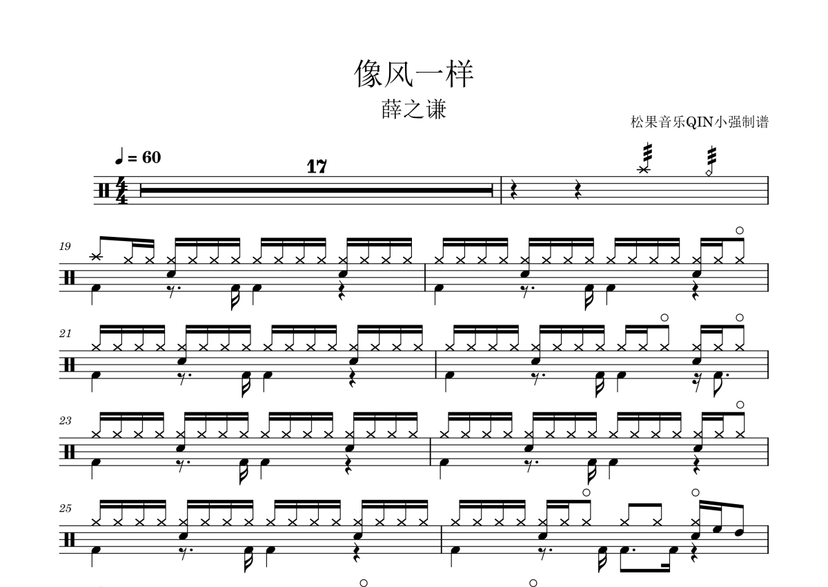 《像风一样》是薛之谦演唱的一首歌曲,拍号为4/4拍,这份架子鼓谱共有一张高清图谱,图谱由 @松果音乐QIN小强 编配上传,图谱使用五线谱编配,使用这份像风一样架子鼓谱,你将能够轻松地敲打出这首薛之谦的像风一样,快来尝试吧。《像风一样》是薛之谦演唱的流行歌曲,由薛之谦创作词曲,张宝宇、郑伟编曲,收录在薛之谦于2017年11月28日发行的专辑《渡》中。同时,该曲也是电视剧《小女花不弃》的插曲。