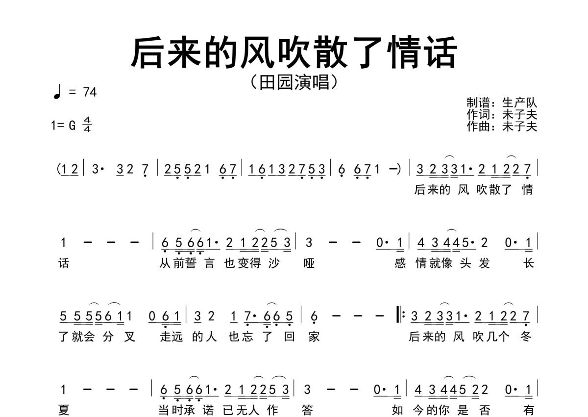 《后来的风吹散了情话》是田园演唱的一首歌曲,原版简谱,拍号为4/4拍,歌曲速度为每分钟74拍,这份简谱共有一张高清图谱,图谱由 @生产队 编配上传田园演唱的歌曲《后来的风吹散了情话》原版简谱,精准的前奏、间奏、尾奏solo编配,精编完美版,值得推荐!。
