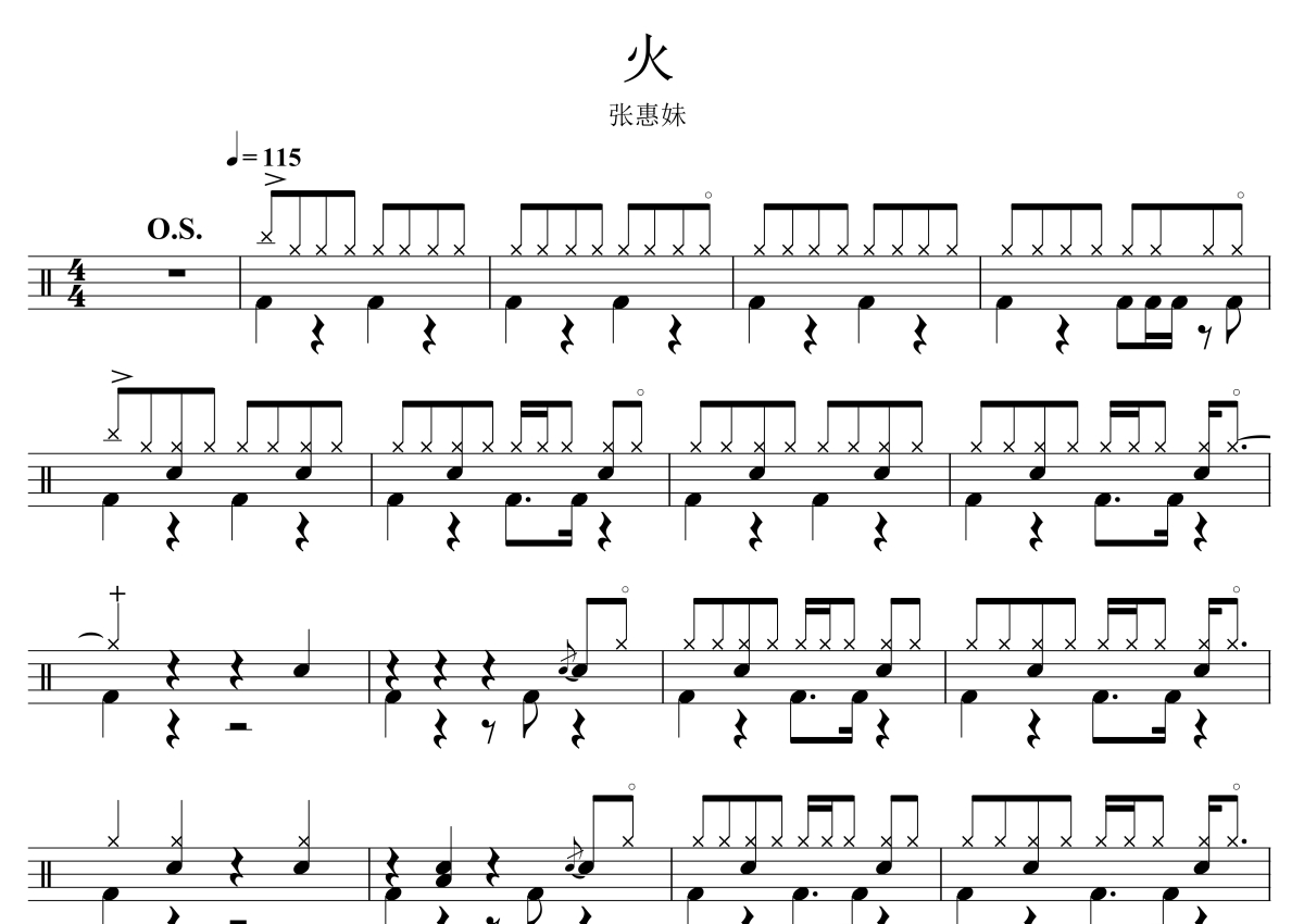 《火》是张惠妹演唱的一首歌曲,拍号为4/4拍,歌曲速度为每分钟115拍,这份架子鼓谱共有三张高清图谱,图谱由 @音符喷血者 编配上传,图谱使用五线谱编配,使用这份火架子鼓谱,你将能够轻松地敲打出这首张惠妹的火,快来尝试吧。