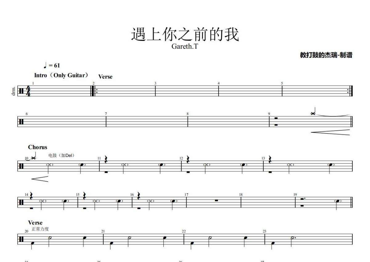 《遇上你之前的我》是Gareth.T演唱的一首歌曲,拍号为4/4拍,歌曲速度为每分钟61拍,这份架子鼓谱共有一张高清图谱,图谱由 @Jerry 编配上传,图谱使用五线谱编配,使用这份遇上你之前的我架子鼓谱,你将能够轻松地敲打出这首Gareth.T的遇上你之前的我,快来尝试吧。