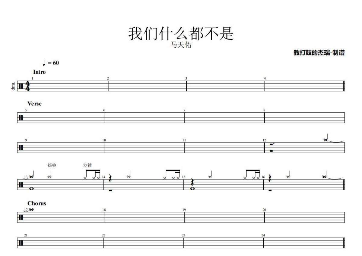 《我们什么都不是》是马天佑演唱的一首歌曲,拍号为4/4拍,歌曲速度为每分钟60拍,这份架子鼓谱共有一张高清图谱,图谱由 @Jerry 编配上传,图谱使用五线谱编配,使用这份我们什么都不是架子鼓谱,你将能够轻松地敲打出这首马天佑的我们什么都不是,快来尝试吧。