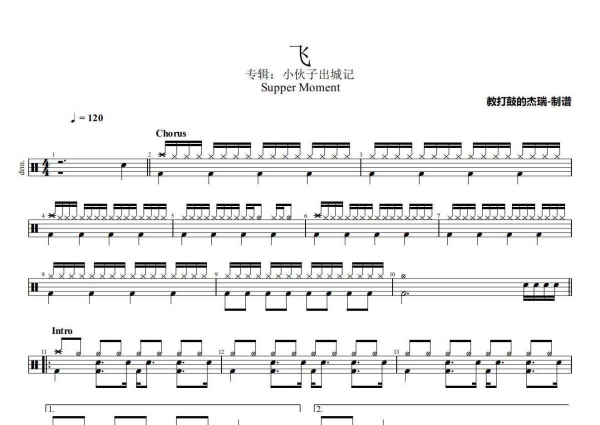《飞》是Supper Moment演唱的一首歌曲,拍号为4/4拍,歌曲速度为每分钟120拍,这份架子鼓谱共有四张高清图谱,图谱由 @Jerry 编配上传,图谱使用五线谱编配,使用这份飞架子鼓谱,你将能够轻松地敲打出这首Supper Moment的飞,快来尝试吧。