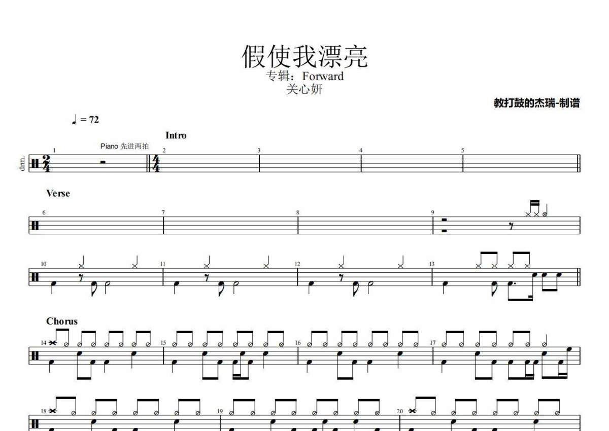 《假使我漂亮》是关心妍演唱的一首歌曲,拍号为4/4拍,歌曲速度为每分钟72拍,这份架子鼓谱共有两张高清图谱,图谱由 @Jerry 编配上传,图谱使用五线谱编配,使用这份假使我漂亮架子鼓谱,你将能够轻松地敲打出这首关心妍的假使我漂亮,快来尝试吧。