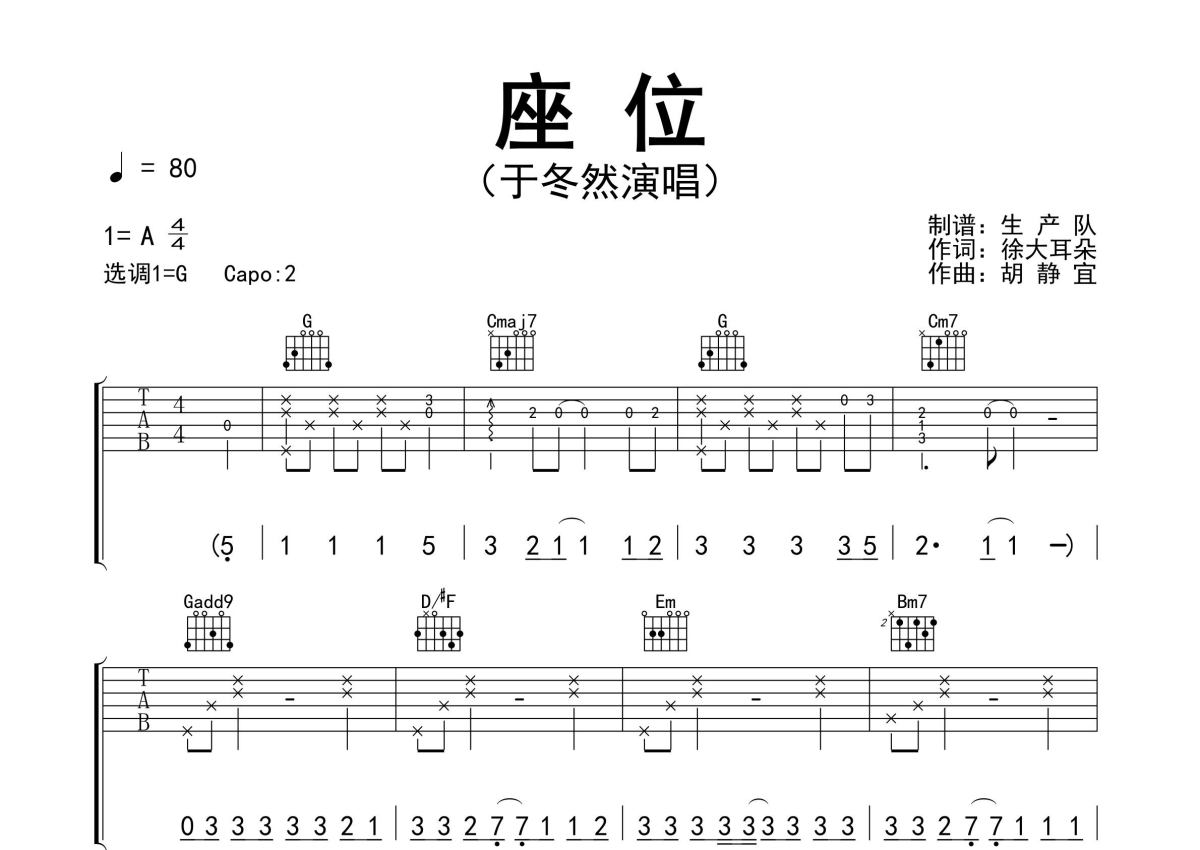 《座位》是于冬然演唱的一首歌曲,精编完美版,拍号为4/4拍,歌曲速度为每分钟80拍,歌曲原调为A调,但由于原调指法比较难,为了方便弹奏,本吉他谱采用的是G调指法编配,变调夹2品弹奏即为原调,当然也可以根据自己的音域改变变调夹位置,或者通过改变和弦调性,以方便自己弹奏,这份吉他谱共有三张高清图谱,图谱由 @生产队 编配上传,图谱使用六线谱编配,包含吉他和弦指法、简谱以及歌词部分,使用这份座位吉他谱,可以让你更加方便地掌握这首歌曲的弹唱技巧,快来尝试吧。于冬然演唱的歌曲《座位》原版吉他谱,精准的前奏、间奏、尾奏solo编配,精编完美版,值得推荐!。