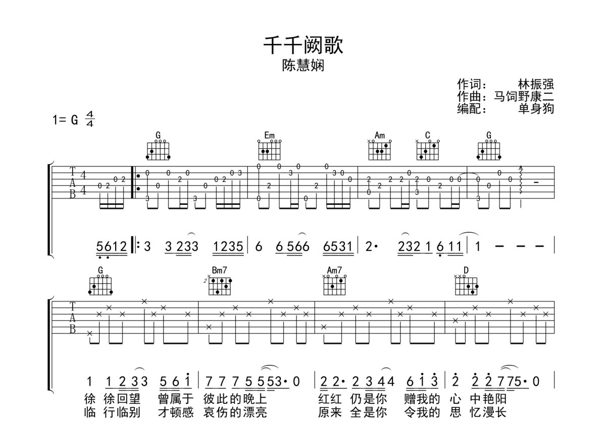 《千千阙歌》是陈慧娴演唱的一首歌曲,本吉他谱采用的是G调指法编配,这份吉他谱共有三张高清图谱,图谱由 @单身狗 编配上传,图谱使用六线谱编配,包含吉他和弦指法、简谱以及歌词部分,使用这份千千阙歌吉他谱,可以让你更加方便地掌握这首歌曲的弹唱技巧,快来尝试吧。陈慧娴《千千阙歌》吉他弹唱谱,采用G调指法编配,单身狗编配出品,共有3张高清图谱。