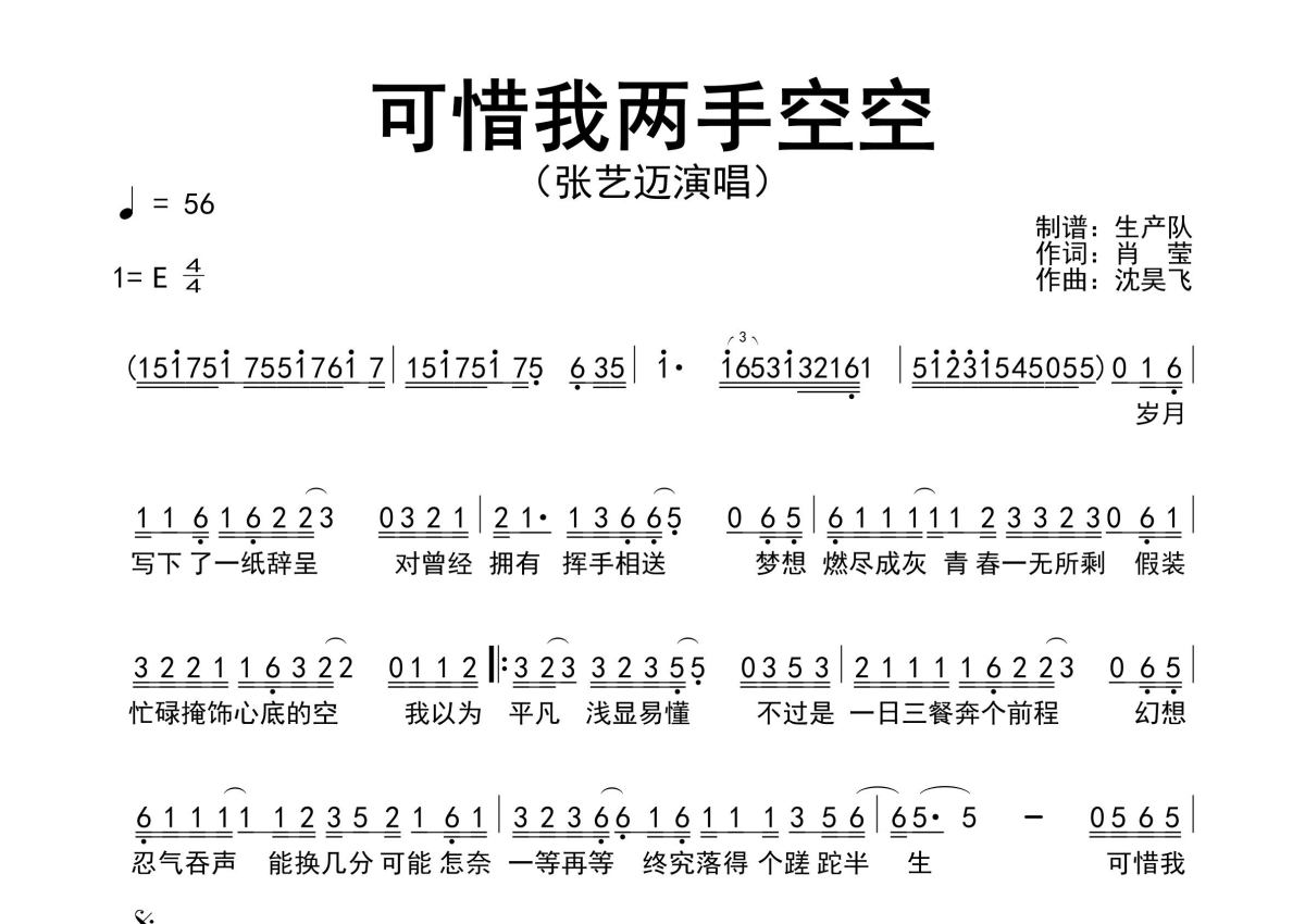 《可惜我两手空空》是张艺迈演唱的一首歌曲,原版简谱,拍号为4/4拍,歌曲速度为每分钟56拍,这份简谱共有一张高清图谱,图谱由 @生产队 编配上传张艺迈演唱的歌曲《可惜我两手空空》原版简谱,精准的前奏、间奏solo编配,精编完美版,值得推荐!。