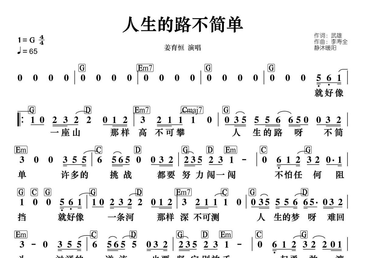 《人生的路不简单》是姜育恒演唱的一首歌曲,和弦谱,拍号为4/4拍,歌曲速度为每分钟64拍,这份简谱共有一张高清图谱,图谱由 @静沐暖阳 编配上传。