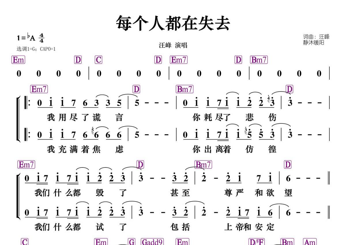 《每个人都在失去》是汪峰演唱的一首歌曲,和弦谱,拍号为3/4拍,这份简谱共有一张高清图谱,图谱由 @静沐暖阳 编配上传。