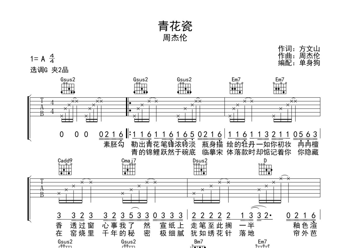 周杰伦《青花瓷》吉他谱 - G调弹唱六线谱