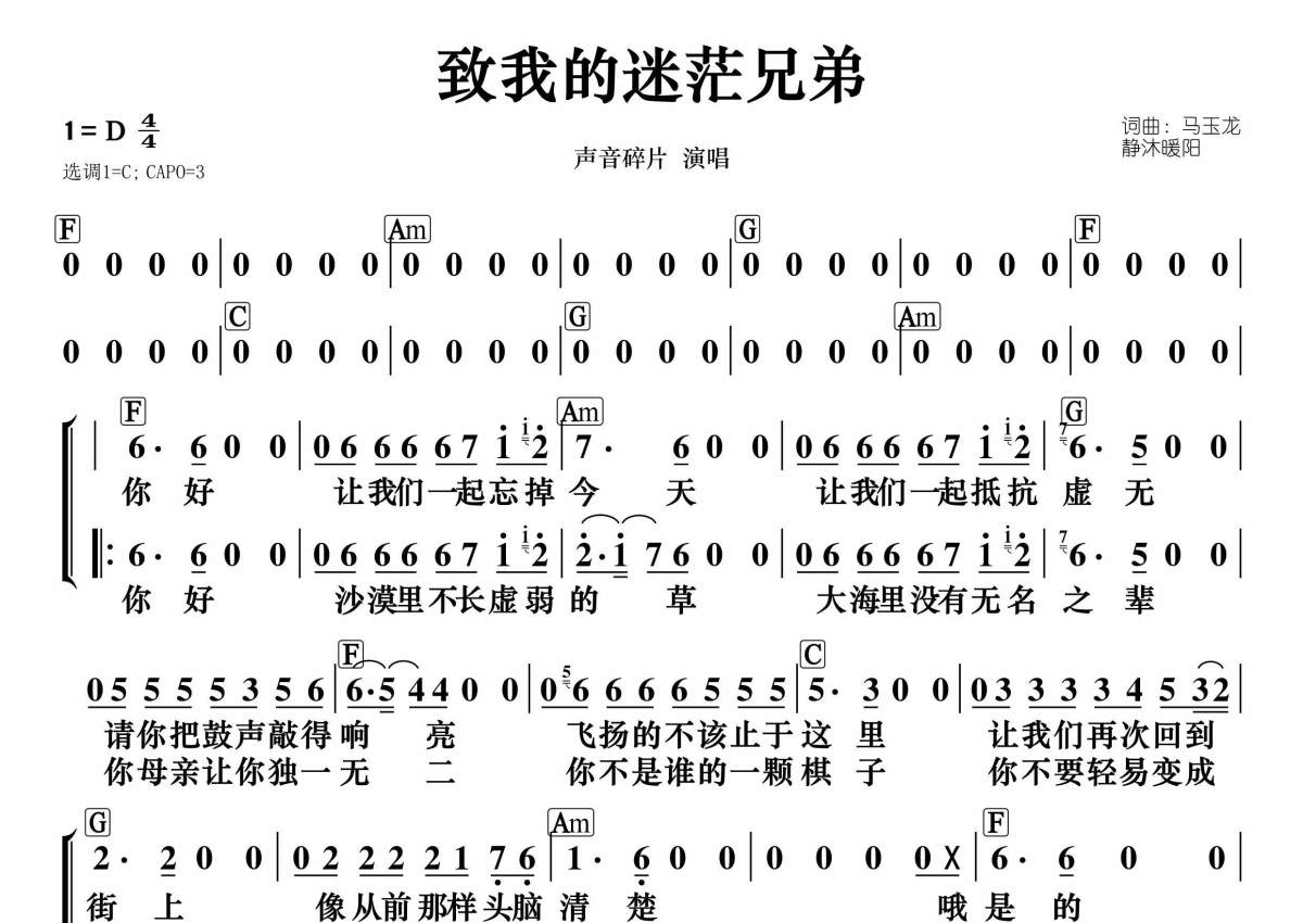 《致我的迷茫兄弟》是声音碎片演唱的一首歌曲,和弦谱,拍号为4/4拍,这份简谱共有一张高清图谱,图谱由 @静沐暖阳 编配上传。