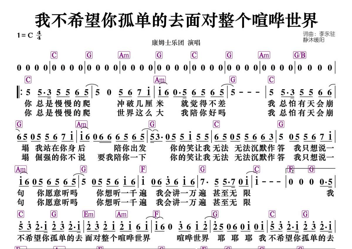 《我不希望你孤单的去面对整个喧哗的世界》是康姆士乐队演唱的一首歌曲,和弦谱,拍号为4/4拍,这份简谱共有一张高清图谱,图谱由 @静沐暖阳 编配上传。
