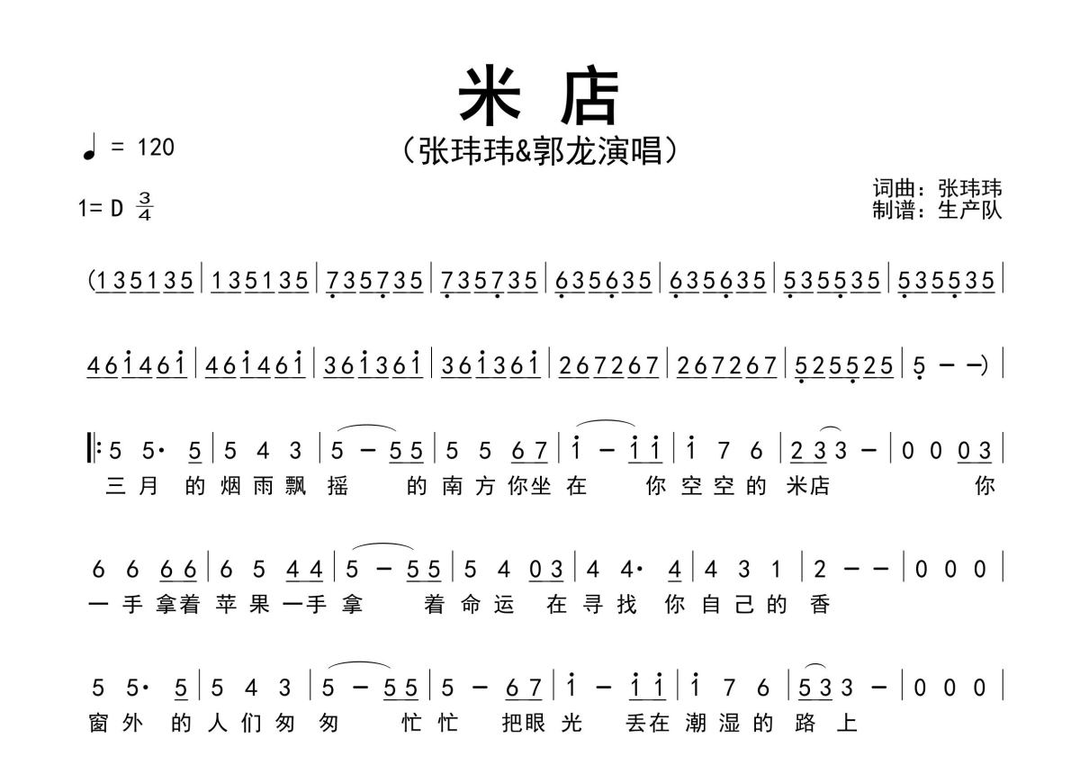 《米店》是张玮玮&郭龙演唱的一首歌曲,原版简谱,拍号为3/4拍,歌曲速度为每分钟120拍,这份简谱共有一张高清图谱,图谱由 @生产队 编配上传张玮玮&郭龙演唱的歌曲《米店》原版简谱,精准的前奏、间奏、尾奏solo编配,精编完美版。