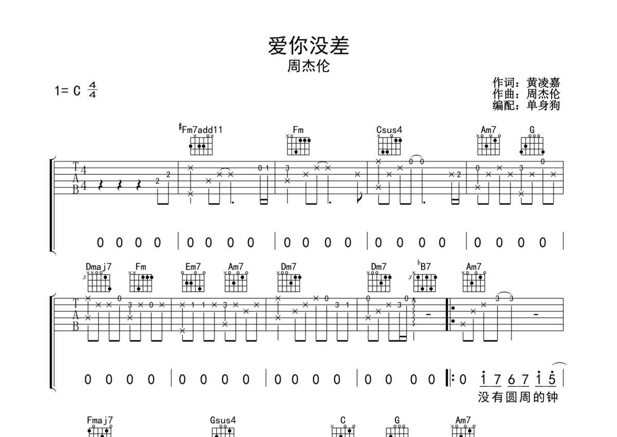 爱你没差吉他谱 - 周杰伦演唱 - C调弹唱六线谱