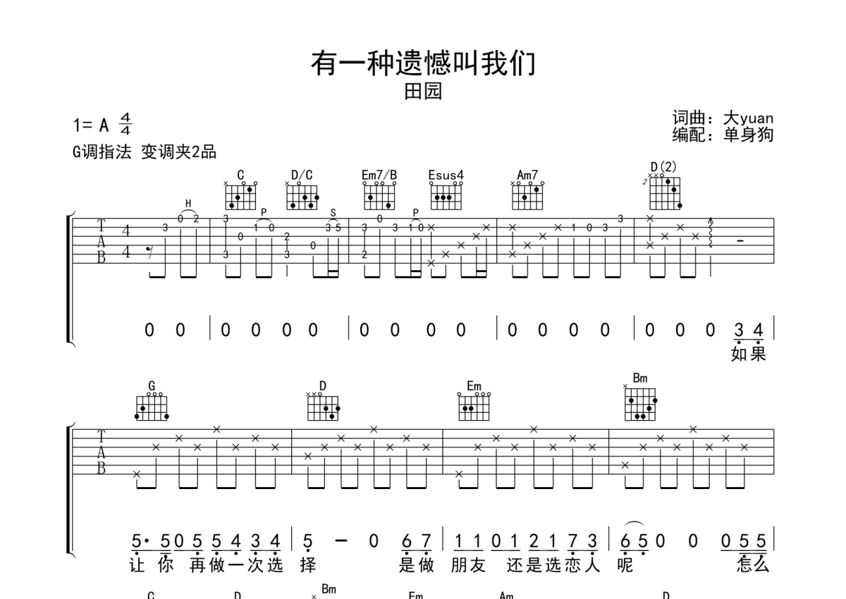 《有一种遗憾叫我们》是田园演唱的一首歌曲,拍号为4/4拍,歌曲原调为A调,但由于原调指法比较难,为了方便弹奏,本吉他谱采用的是G调指法编配,变调夹2品弹奏即为原调,当然也可以根据自己的音域改变变调夹位置,或者通过改变和弦调性,以方便自己弹奏,这份吉他谱共有三张高清图谱,图谱由 @单身狗 编配上传,图谱使用六线谱编配,包含吉他和弦指法、简谱以及歌词部分,使用这份有一种遗憾叫我们吉他谱,可以让你更加方便地掌握这首歌曲的弹唱技巧,快来尝试吧。
